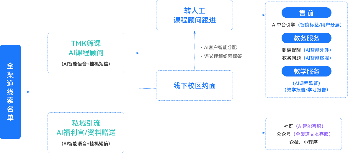 学员众多,课程通知和售后回访人力成本、时间成本高。重复性劳动,人员积极性低,客服工作人员流失率居高不下。